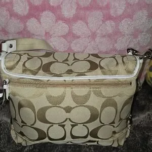 The bag in the image is a Coach Daisy Signature Messenger Bag (style number likely F16557 or F16558), featuring the classic khaki signature canvas with white leather trim. This style was part of the early 2000s "Daisy" collection.