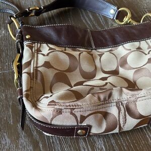 Stylish Coach shoulder bag with signature pattern. Rich brown leather accents. Perfect for everyday use.