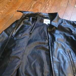 Chic faux leather coat with a sleek design. Features a classic collar and zip closure.
