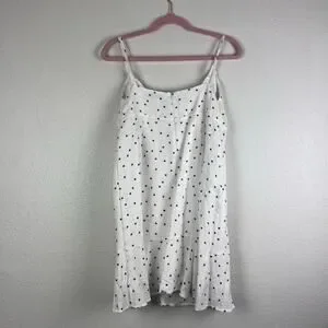 Q&A tie front mini dress in women’s size M. Lightweight and flowy with an allover black star print, adjustable spaghetti straps, and a flirty tiered hem—perfect for summer, festivals, or casual days.