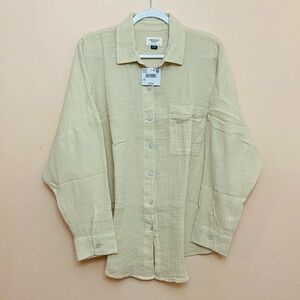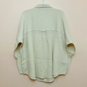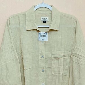 New with tags American Eagle Go Big Oversized Shirt. ⭐️Color: Tan ⭐️Lightweight & breezy woven cotton ⭐️Long sleeves with roll-and-button-up cuffs ⭐️Button-up front with left chest pocket ⭐️Collar ⭐️Curved hem ⭐️Oversized fit: baggier for a relaxed & roomy fit ⭐️Longer length: hits most below waistband ⭐️100% Cotton ⭐️Imported ⭐️Approximate measurements: -Pit to pit 30” -Length 28 1/2” -Arm length 15”.