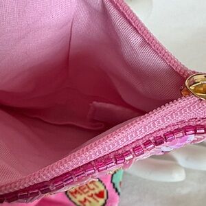 Charming beaded pouch featuring vibrant heart designs. Perfect for kids to store their treasures. Bright pink and multicolor beads add a playful touch.