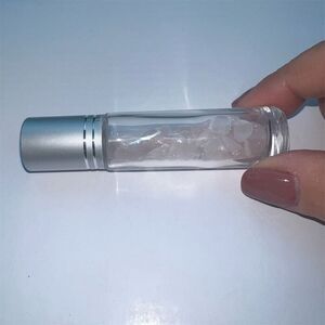 This essential oil roller bottle is crafted from clear glass and features a rose quartz rollerball, designed for aromatherapy use. It holds a volume of 10 ml .The item is new with tags. Keywords: essential oil, roller bottle, glass, rose quartz, aromatherapy, 10 ml.