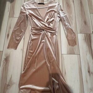 Stylish Zara dress with a draped front. Features lace-trimmed sleeves. Perfect for elegant occasions.