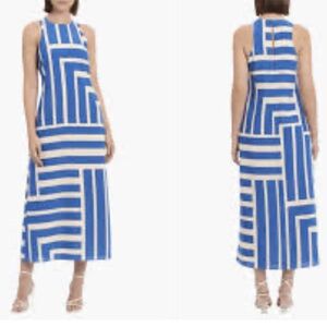 Chic blue and white midi dress. Bold geometric pattern. Perfect for any occasion.