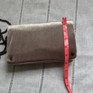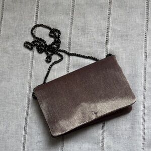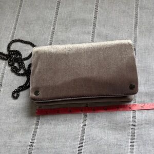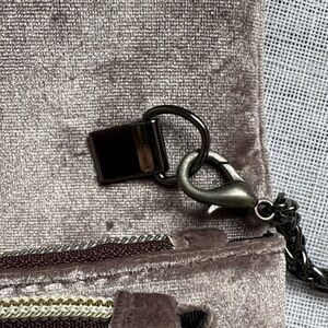 Street Level Velvet Lavender Crossbody/Clutch Bag. This bag is a versatile, soft-textured accessory designed for transitioning between casual daywear and elevated evening looks. This bag also features a luxurious velvet exterior in a lavender hue (almost silvery) with a plush, velvety finish. It features a detachable chain link strap and magnetic snap flap closure and interior zippered compartments.
