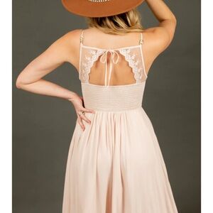 This elegant champagne dress features delicate lace trim and a flowing silhouette, perfect for any occasion. The soft color and intricate details make it a standout piece in your wardrobe.
