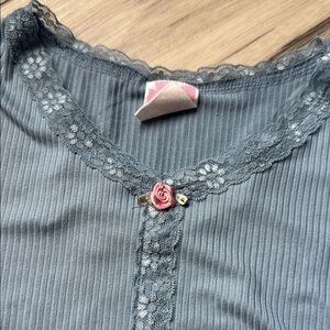 This elegant blue top features a delicate lace trim, perfect for adding a touch of sophistication to your wardrobe. Slight pilling but overall good condition