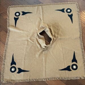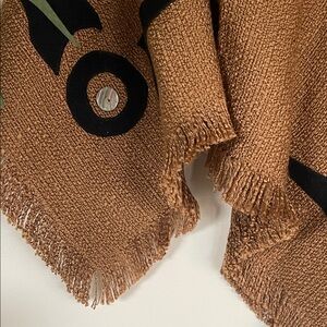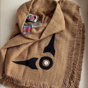 Extras: Comes with original tags and an extra set of replacement buttons in a small pouch.Stylish brown shawl with fringe detailing. Features a bold black design. Beautifully made by local indigenous female artists. This piece is very soft. New with tags.