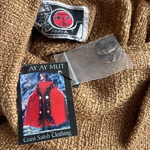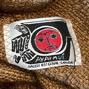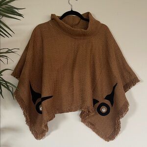 This is a stunning, authentic piece of Coast Salish Clothing by Ay Ay Mut, handcrafted in Canada. A beautiful blend of traditional Indigenous artistry and modern wearable fashion, this poncho features a rich, textured knit in a warm earthy tan/toffee shade.
