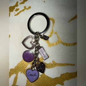 Chic Coach keychain with purple and silver heart charms. Features iconic Coach logo. Perfect for stylish accessory lovers.