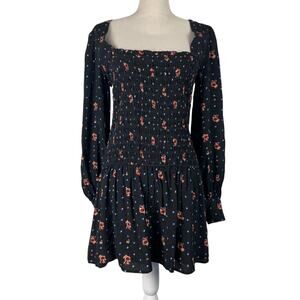 Free People Two Faces Mini Dress Black Floral Smocked Long Sleeve Size S