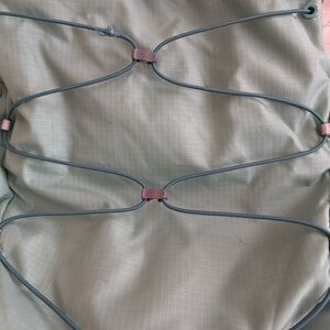Light green backpack by The North Face. Features front bungee cords and adjustable straps.