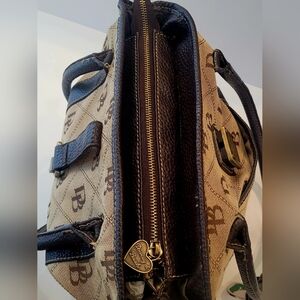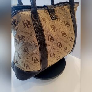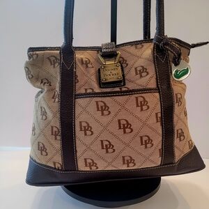 Vintage from the 80s. Features signature DB pattern and green duck. This bag is in great condition considering her age. Durable double leather handles with a 19" drop. Perfect for everyday use.