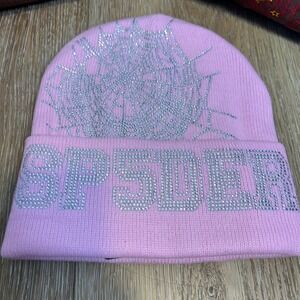 The hoodie and joggers feature the signature 555 / angel number graphic, star accents, and bold street appeal. The beanie adds a contrasting pop of color with a rhinestone web motif and SP5DER branding.