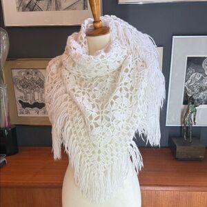 Beautiful white crochet poncho with fringe detailing. Perfect for layering.