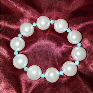 Beautiful stretch bracelet featuring large, heavy glass pearl beads accented with turquoise-colored stone spacer beads. The glass pearls have a luminous, iridescent finish, while the stone spacers add natural texture and contrast.