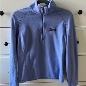 Light blue zip-up sweater by Patagonia. Ideal for layering and outdoor activities.