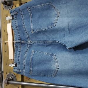 washed. loose waistband, overlap asymmetrical four button fly all present, wide leg