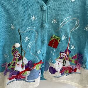 winter snowman embroidered blue vintage sweater vest by tiara international M