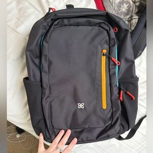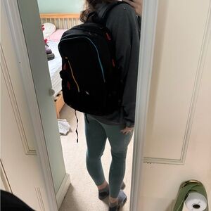 Stylish black backpack featuring vibrant orange accents. Perfect for daily use and travel. Currently on sale for $88, selling for $55!