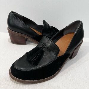 NEW Anthropologie Seychelles Black Leather Suede Tassel High Heel Loafer Shoes 8