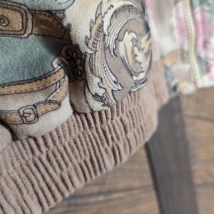 Add a touch of elegance to your wardrobe with this floral bomber jacket. The pink and tan design offers a stylish and versatile look. 80's cute zip jacket. Zipper is in perfect working condition. There are a few dark spots on the collar as pictured and a few loose threads under where the neck part folds down as pictured. So cute. Would make a cute oversized granny core fit.