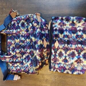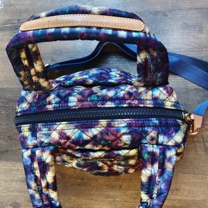 The small Sutton Deluxe is made of nylon with leather trim. The color is called winter prism and it is purple, blue, yellow, white mix. The bag has 2 exterior pockets and several pockets inside. It comes with one detachable pouch and crossbody strap.
