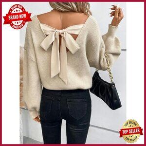 V-Neck Off Shoulder Sweater with Tie Back, Long Sleeve Knit Top