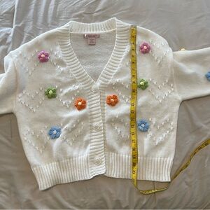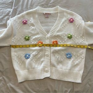 This charming women's sweater features colorful floral embroidery on a soft cream background. Perfect for adding a touch of whimsy to your wardrobe.
