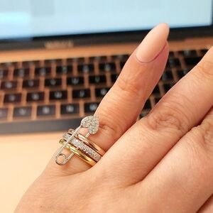 This stunning tri-color ring with Cubic Zirconia features a heart pin design. Pin is detachable, you can remove it and wear the rings separately. Perfect for adding a touch of elegance to any outfit. Approx size 5.5/6