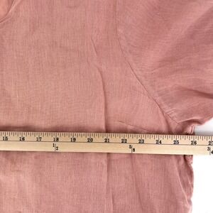 La Fixsun coral peach pink 100% linen tunic top. Features a flattering V neckline, a gently asymmetrical hemline with side slits, and wide 3/4 length sleeves. Lagenlook style. Pullover.