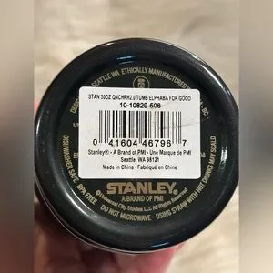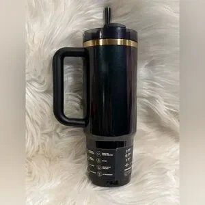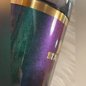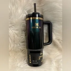 Stylish Stanley tumbler with a handle. Features an iridescent finish and gold accents. Ideal for hydration on the go.