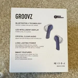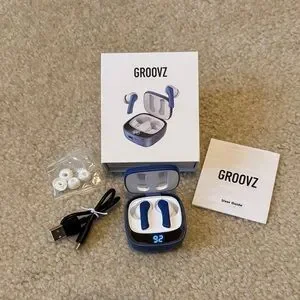 Includes Bluetooth headsets, headphone charging case, interchangeable earbud tips, type-C charging cable, & user guide. Charging cable is packaged in small white box in the groovz box.