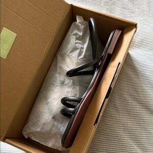 Sleek black sandals with a stylish strap design. Ideal for versatile wear. New in box!