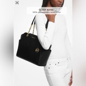 Brand new with tags. Authentic Michael Kors Jacquelyn Tote in black pebbles leather. Classic structured shape with gold-tone hardware, MK logo charm, and spacious interior. Perfect for work, travel, or everyday use. Never carried. Smoke-free home.