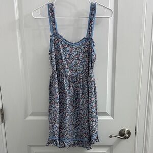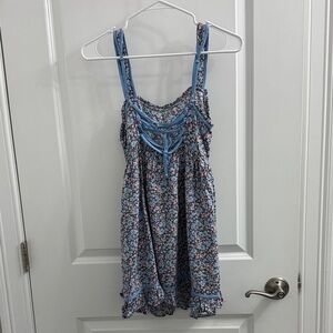 Charming floral dress with a blue base. Features sleeveless design, ruffled hem and pockets.