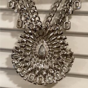Dazzling necklace with silver and gold tones. Features intricate chain design. Perfect for any occasion.