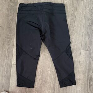 Comfortable black workout capris leggings by Athleta. Features mesh side detail. Ideal for fitness and everyday wear.