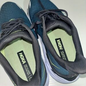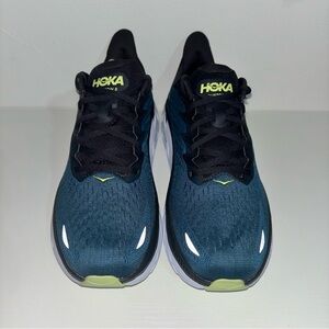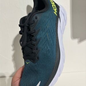 Men’s HOKA One One Clifton 8 running shoes, size 10. Lightweight, cushioned, and comfortable—perfect for running, walking, or everyday wear. Jade color upper with black and lime details. Shoes look darker in pictures.