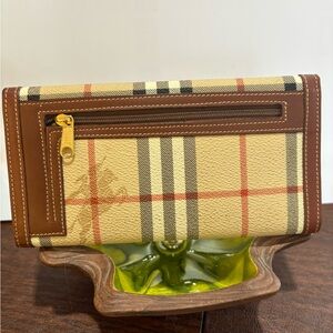 Vintage Burberry Haymarket Check coated canvas long wallet with brown leather trim.