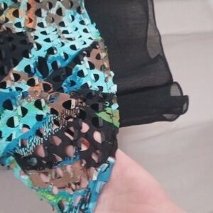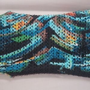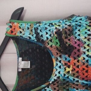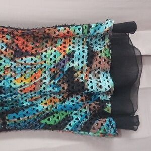 M Alberto Makali sleeveless top. sheer black base with a multicolor cut-out style overlay. measurements can be found in the photos. excellent pre-owned condition.