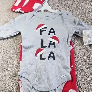 Charming bodysuit set with playful holiday design. Includes matching hat and pants. Perfect for festive occasions.