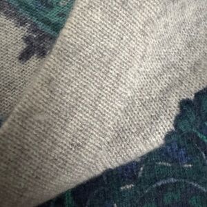 Elegant cashmere sweater with a subtle pattern. Features gray and teal hues. Super soft and cozy, great with any outfit. Size X. Sleeve length from armpit 15” wide between armpits all around 44” length 30”