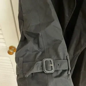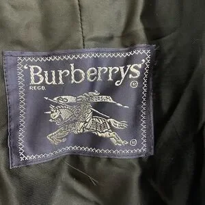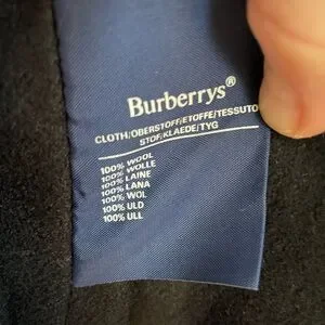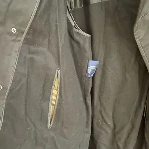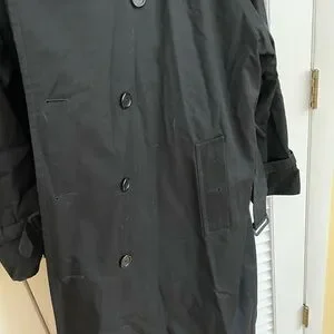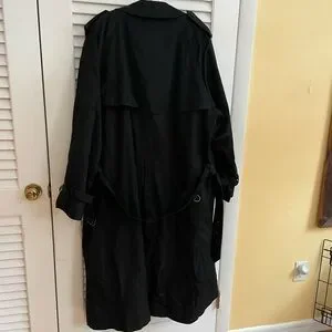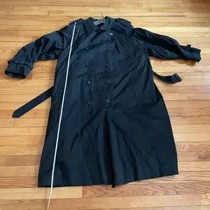 Men’s black, wool-lined Burberry trench coat. No size tag but PTP is 27” and length is 46”.