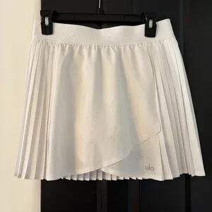 So cute and flattering! This chic white Alo skort features a pleated back and a clean, wrapped front for a sleek, feminine silhouette. Built-in shorts make it perfect for tennis, pickleball, Pilates, or everyday athleisure.