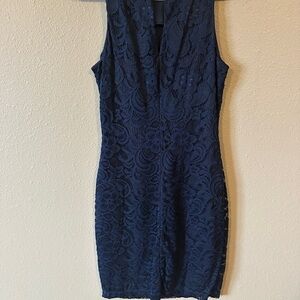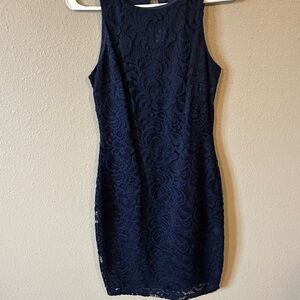 Chic navy lace mini dress. Perfect for parties or evenings out. Features intricate lace detailing.