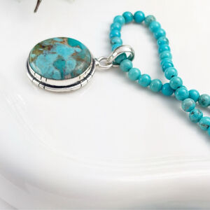 Round Mohave Turquoise Pendant and Mohave Turquoise 4mm Bead Necklace 18” Vintage Southwest Cowgirl Boho Southwestern Style New without tags. Includes packaging and organza bag. 925 Stamped High Quality Sterling Silver 925 Filled Overlay. Genuine Gemstone jewelry made well to last.