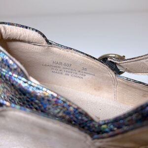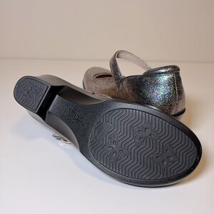 2.5” block heels. Slip resistant bottoms. Iridescent color with gold buckle strap. Buckle is accented with a rhinestone.