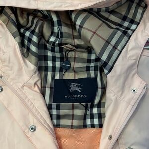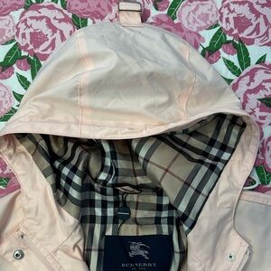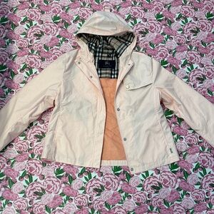 Elegant Burberry light pink jacket with a hood. Features classic Burberry lining. Ideal for casual wear.